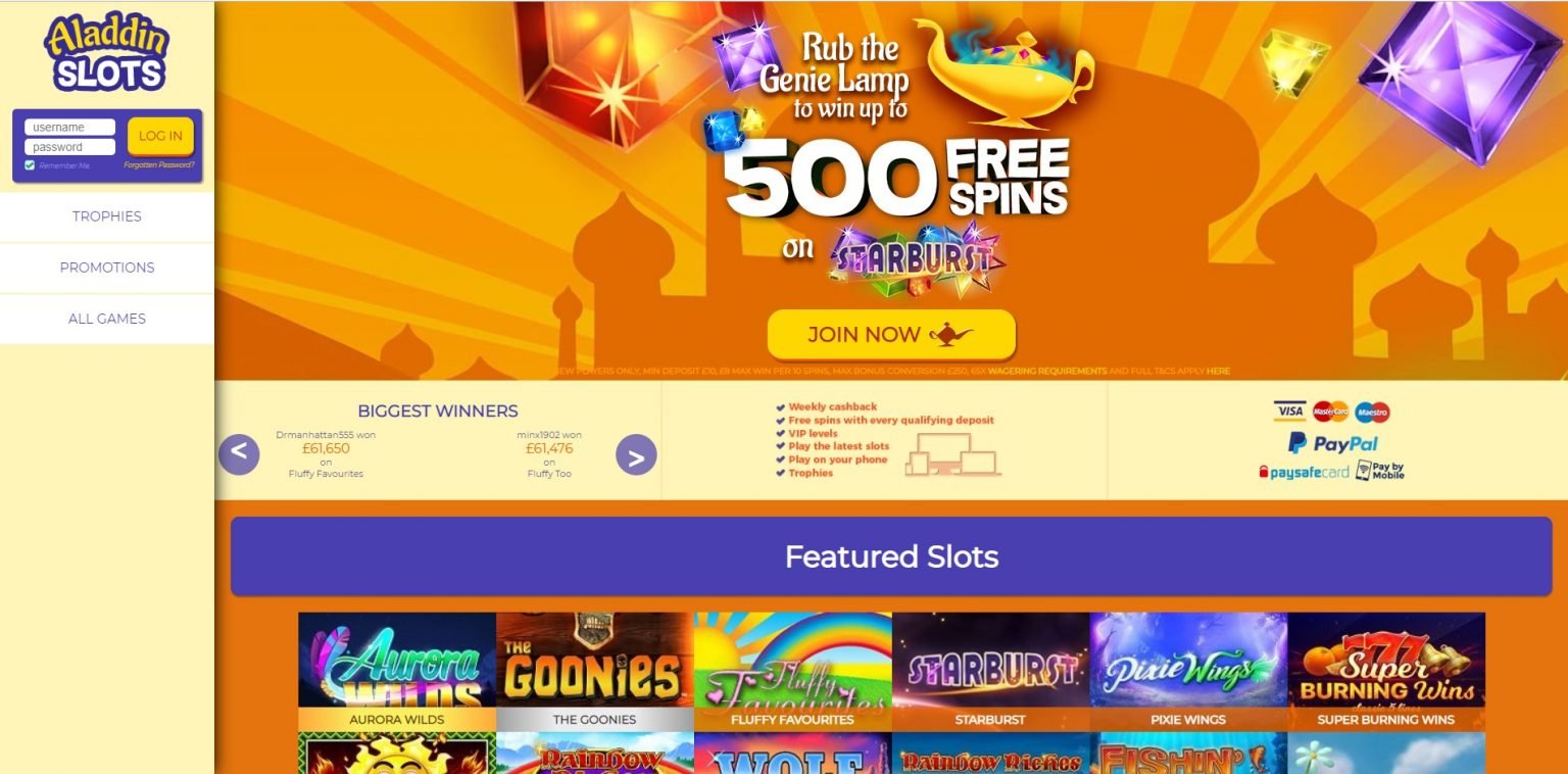 Aladdin Slots Casino intends to spray a little magic energy into online casino gaming. When new players subscribe to Aladdin Slots, they get to rub the magic light to win as much as 500 free spins on Starburst. That’s just one of many promotional offers...